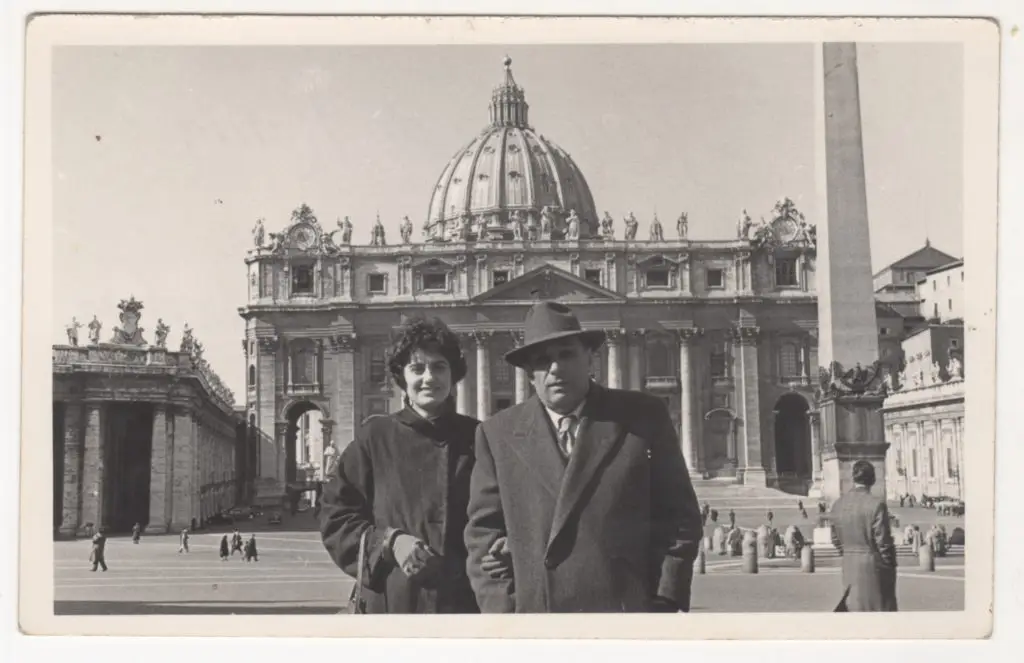 Tre fotografie in effetti ritraggono i miei genitori a Roma nel 1955 davanti alla Basilica di San Pietro; le parole della mamma mi hanno sempre fatto immaginare di essere presente con loro, in quel momento prima della nascita, come minuscolo aggregato di cellule nel ventre della mamma. Essere presente quando ancora non c’ero: un bel pensiero.