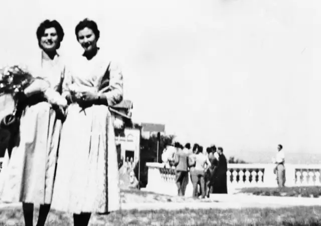 Questa ricerca mi è, però, stata utile anche per un’altra ragione: pensavo di non avere alcuna immagine di quel 9 agosto 1955; e invece non è così. Una fotografia in bianco e nero non perfettamente a fuoco ritrae mia mamma con un mazzo di fiori in mano a braccetto di una bella ragazza. Entrambe sono vestite in chiaro. Dietro alle due c’è un edificio che ricorda una baita, alla loro destra un gruppo di persone con un religioso, accanto a questi un’importante balaustra che delimita uno spiazzo verso un ampio panorama indistinguibile per la canicola estiva. Ho sempre pensato che fosse una gita perché ho tante fotografie della mamma in viaggi di gruppo effettuati prima delle nozze.